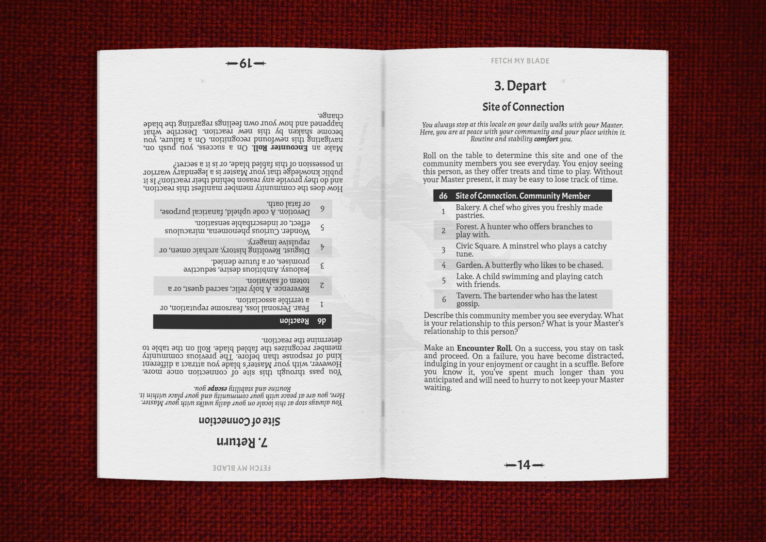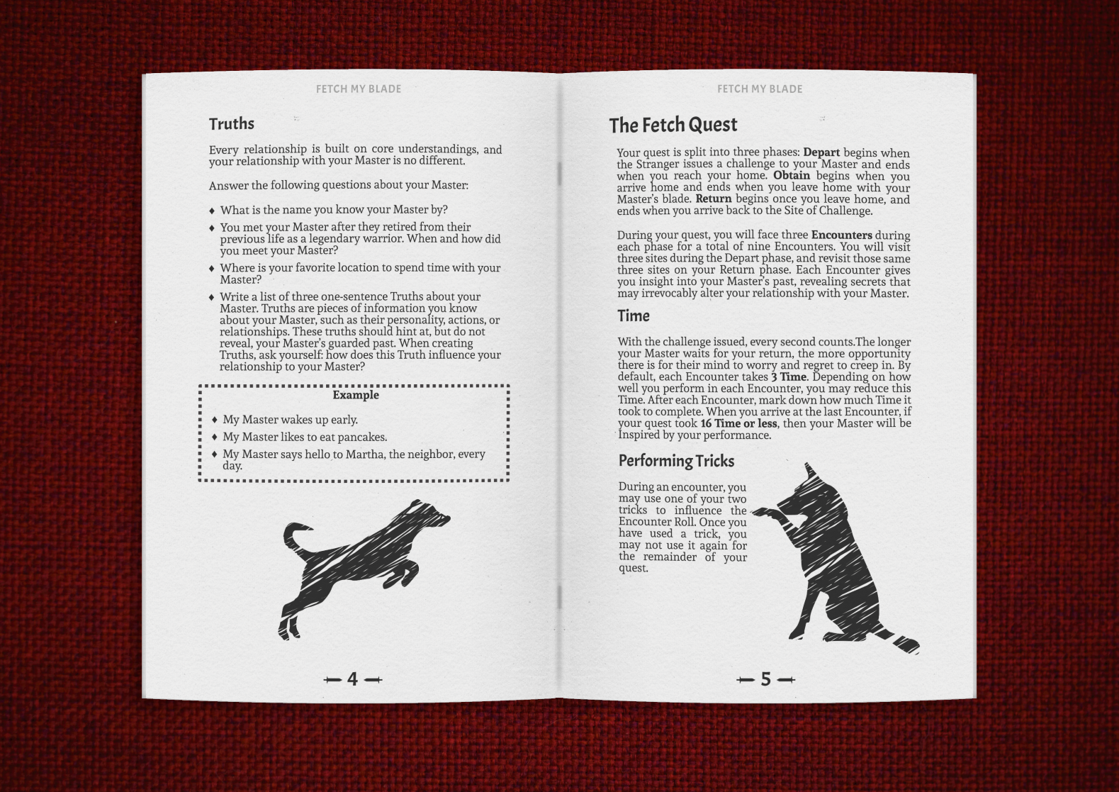 FETCH MY BLADE is a solo journaling roleplaying game where you play as the dog of a retired legendary master of the sword, tasked with a quest of your own: retrieve your master’s fabled weapon in time for their final duel.