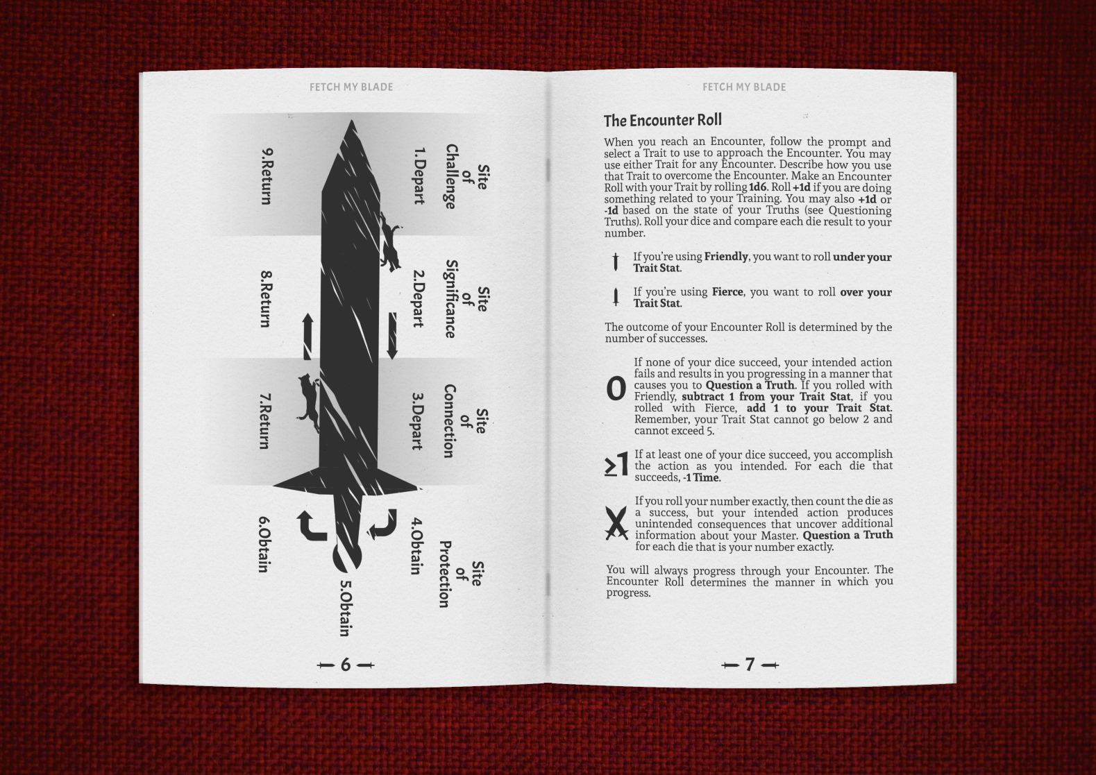 As a fetch quest, you will pass through multiple sites on your way to obtain the blade, and pass through those same sites on your way back. Each encounter is resolved by a ROLL OVER/UNDER DICE POOL SYSTEM that takes into account the Trait you are using, relevant Training you may have, and the state of your Truths. You will always progress through these encounters, but how they impact you, your relationship with your Master, and the timeliness of your quest are determined by the dice.